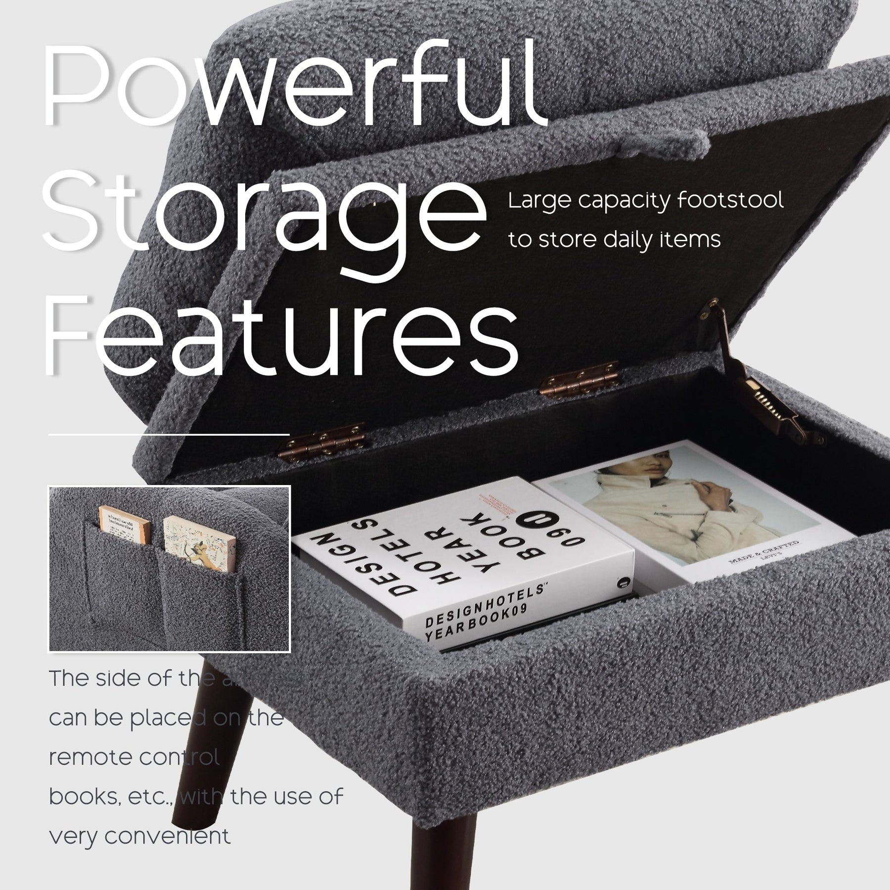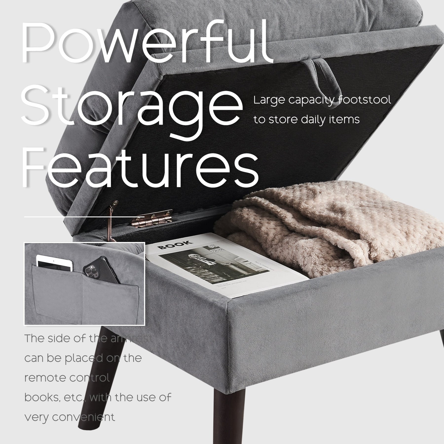 This accent chair with ottoman is partially upgraded on the original basic model, with a large storage pocket added on the side, which is convenient for putting any items you want. ottoman new storage function, a multi-purpose, convenient daily storage, makes your home more tidy, and convenient for your life, to provide you with convenience, the item will be within easy reach of you.