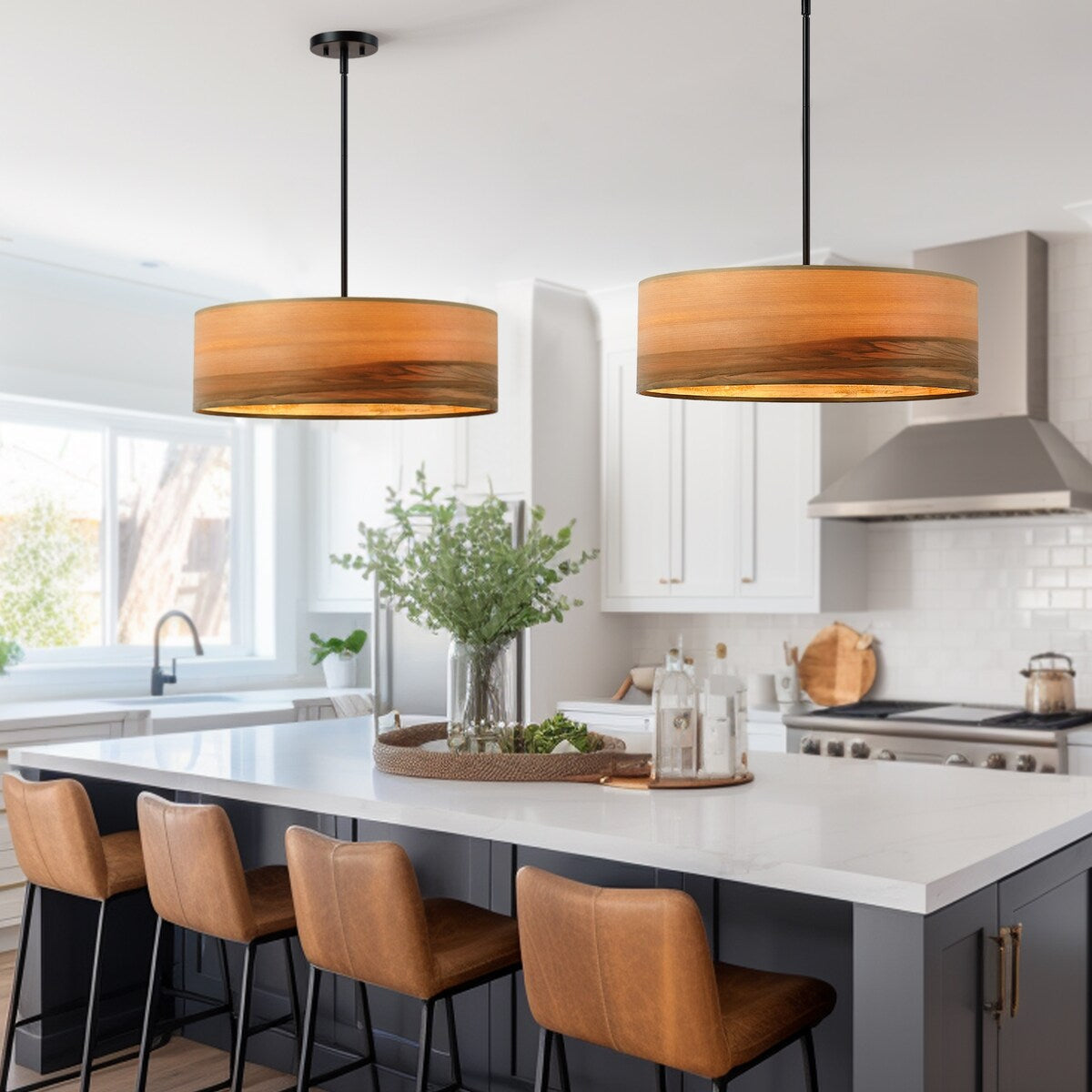 The 22in wide shade is crafted of real apple wood, it perfectly blends in any room decor styles from transitional to contemporary, causal to eclectic or farmhouse, rustic, vintage, etc., with its beauty of nature and subtle glows filtered through when lighting on. It's a real statement-making and eye-catching piece for living room, bedroom, entrance hall, or above kitchen island ,dining table and cafe bar.