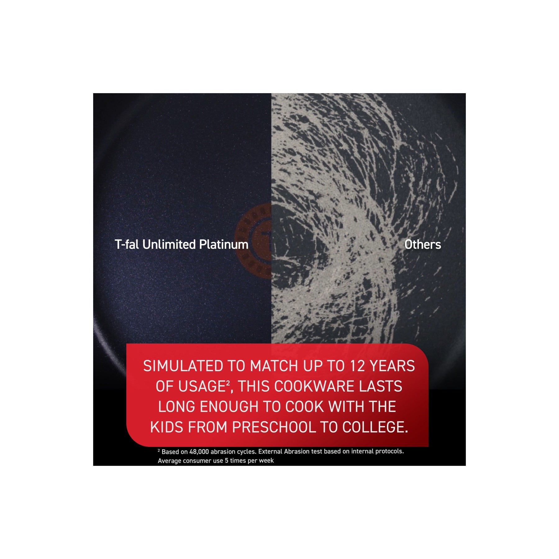 T-fal’s Unlimited Collection is the longest-lasting non-stick in the USA¹. Simulated to match up to 12 years of usage², this cookware lasts long enough to cook with the kids from preschool to college. Equipped with a unique Thermo-Spot heat indicator, you’ll know exactly when your cookware has reached the ideal cooking temperature to bring out your food’s flavor (only fry pans and saute pan). It's versatile, even heat base prevents hotspots and cooks every bite uniformly, and is compatible with all stovetops, including induction. Set Includes: 8.5-inch & 10.5-inch Fry Pans, 1 quart & 2-quart Saucepans with lids, 3.5-quart Saute Pan with lid, 6-quart Dutch Oven with lid, spoon, and turner ¹ Based on abrasion and non-stick external testing done vs top 10 non-stick aluminum competitor pans <$29.99 (excluding hard anodized). 2020 Independent volume data. ² Based on 48,000 abrasion cycles. External Abrasion test based on internal protocols. Average consumer use 5 times per week