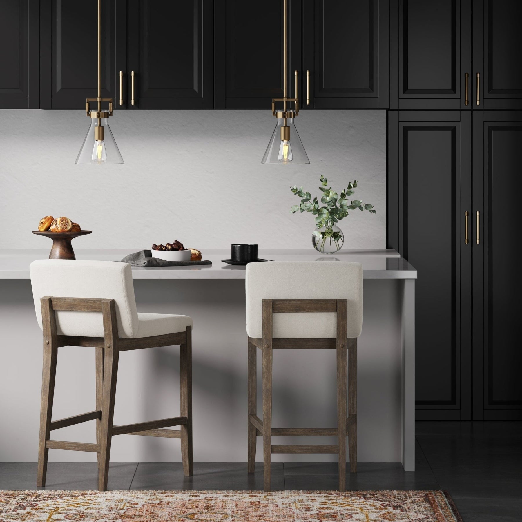 - Gracie features a brushed wood wash on its solid legs and boucle fabric or faux leather upholstery, making it a suitable addition to your modern or farmhouse style kitchen.