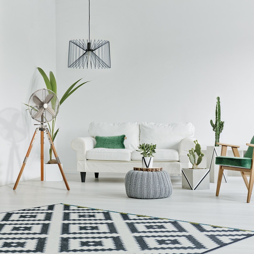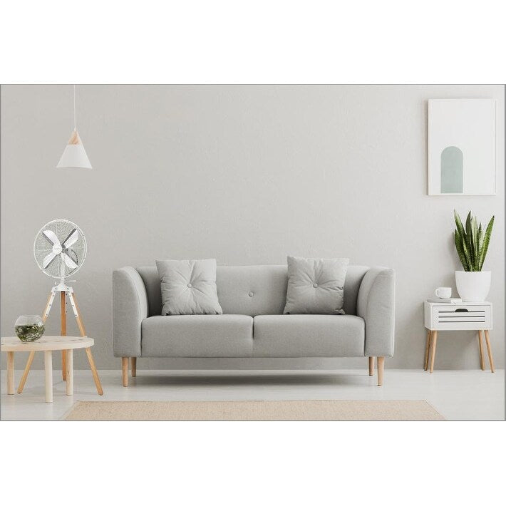 Inspired by a camera stand, this stand fan with tripod legs is an industrial detailed design fan with powerful air movement. The Tripod is high in quality and craftsmanship and will most definitely stand out and add an artistic and inspiring style to any space. The Tripod is height adjustable while assembling- easy process. The fan has a button above the motor for an option of oscillating movemont and the tilting angle.