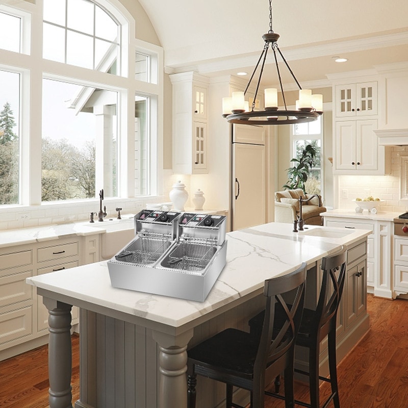 This electric fryer is great for cooking french fries, onion rings, egg rolls, fried chicken, panko shrimp and any other deep fried food. It is made with heavy duty stainless steel construction and comes in a black finish. This fryer has dual electrical heads and power plugs for single large capacity tank application.