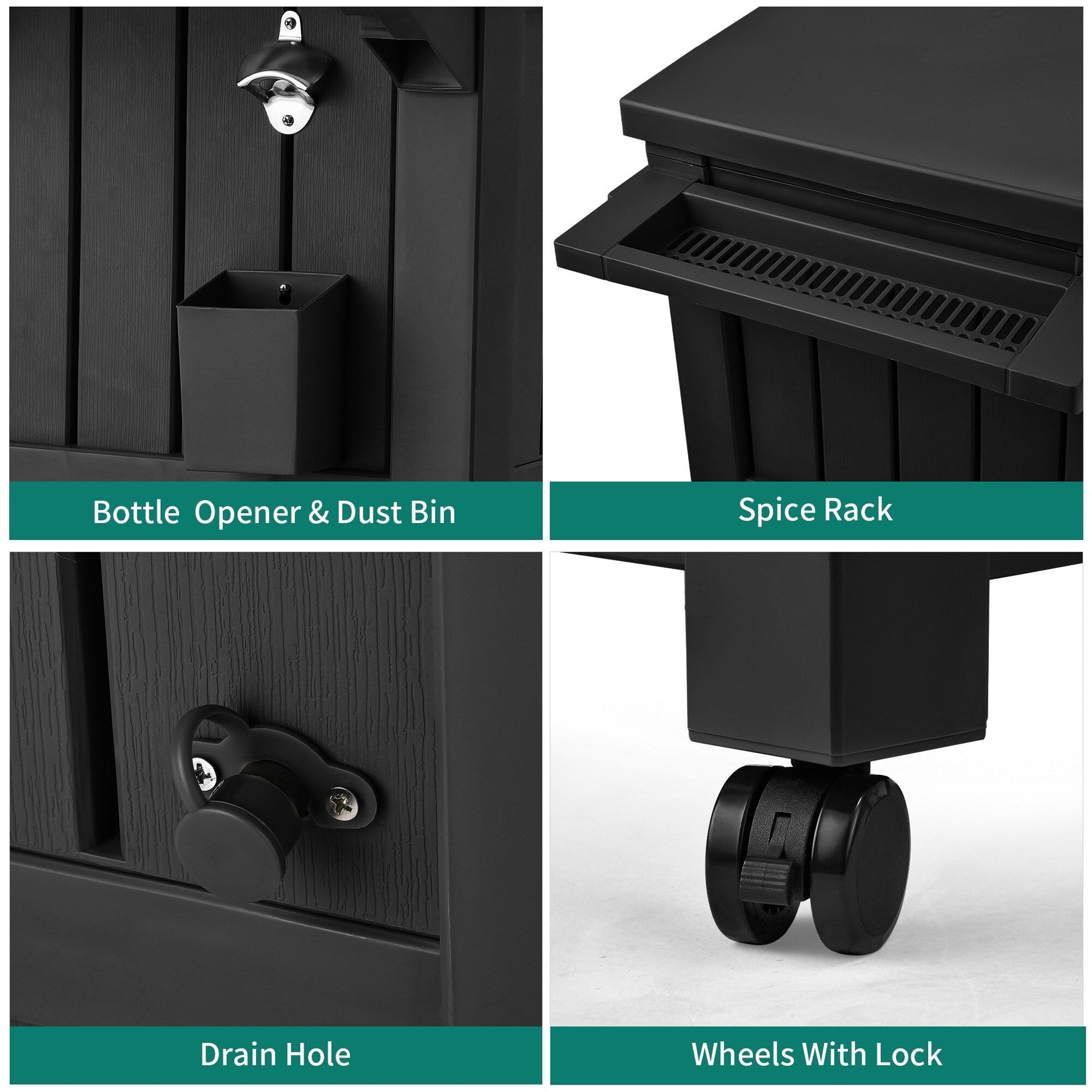 LARGE CAPACITY- This patio cooler cart comes with an 85 qt/21 gallon ice bucket and open storage to chill your beverages for hours.MULTIFUNCTIONAL ACCESSORIES- Features versatile distinct designs including bottle opener, matching trash can, spice rack, and bottom storage space for convenience, as well as the PVC ice bag with drain holes to easily replace water or ice cubes.LOCKING CASTERS- The rolling cooler ice chest enjoys 4 multi-directional rollers, 2 of which are lockable to hold the cooler in place for extra stability on uneven surfaces.QUICK ASSEMBLY- This outdoor beverage cart is made from recyclable and durable resin for easy maintenance; Simply follow the included instructions for an easy installation.PREMIUM MATERIALS- Our Rolling Cooler Carts are built using all-weather resistant resin featuring natural wooden texture for great durability, protection against peeling and denting, a sleek look, and minimal touch.