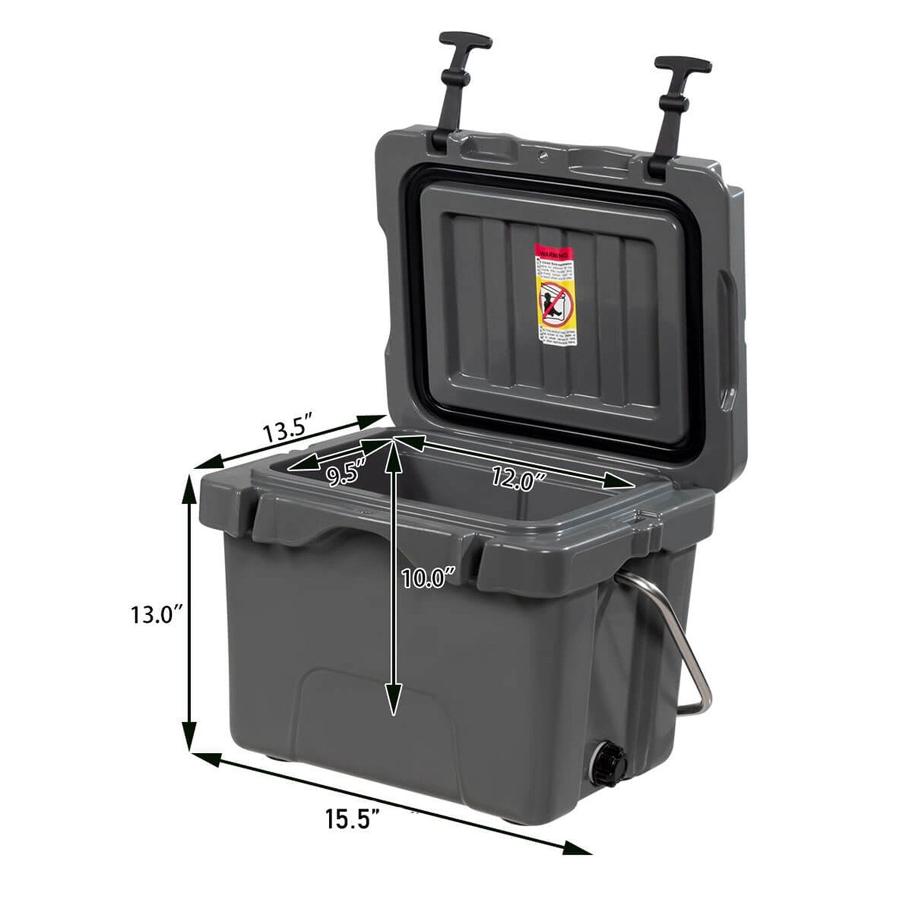 This cooler with perfect performance and indestructible rotomolded construction is undoubtedly your good partner for outdoor activities. Made of premium PE and PU insulating materials, this 16-quart cooler is non-toxic and can keep food beverages and fruit cold for 3-5 days. Featuring portable design, this ice chest can be applied in various situations, such as BBQ parties, picnic, fishing, camping or self-drive travelling. And it can also be used to keep food warm. This cooler is equipped with 2 cup holders, securing latches, lockable lid, stainless steel handle, drain plug and foot pads. All of these thoughtful details make it a perfect cooler.