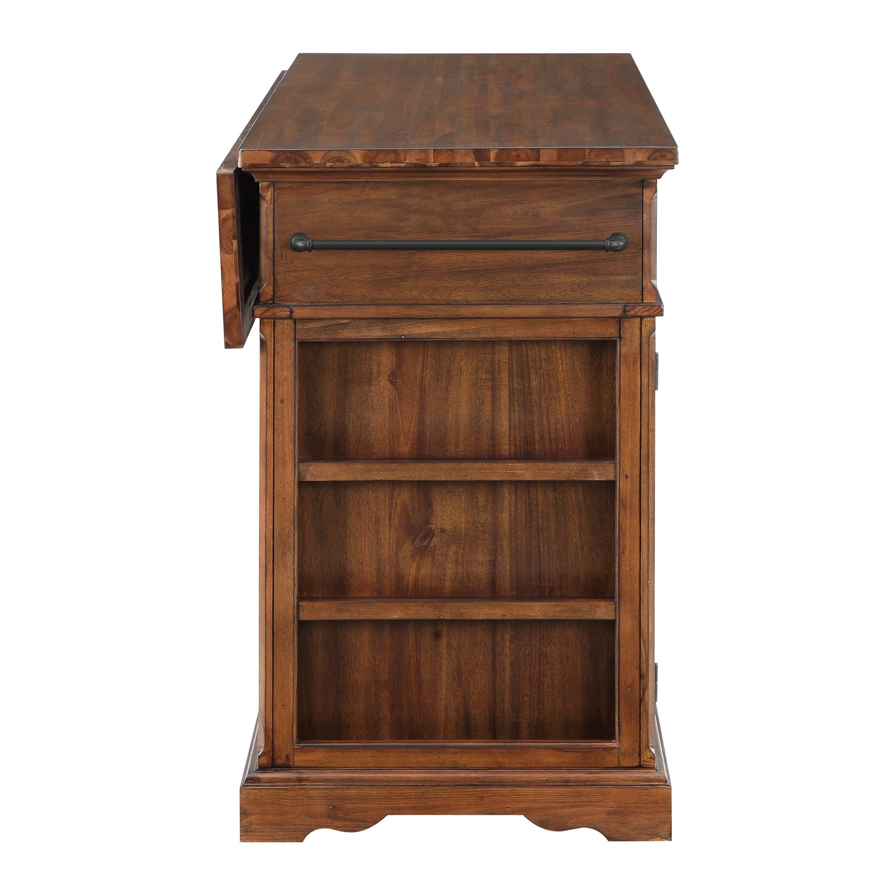 Add the warmth and charm of farmhouse style to your home with our kitchen island. Utensils are at easy reach with our 3-drawer design. Keep large pots, bowls, or countertop appliances tidy and out of sight in our spacious three door cabinet with 2 adjustable shelves. Keep cookie sheets and cutting boards arranged and organized with the convenient divided vertical storage shelves. Small spices can be displayed and handy with the flanking exterior spice racks situated just below a well-positioned towel bar. Made of solid wood and veneers and finished in an 8-step painted finish for long lasting durability. Ships in three cartons and assembly is required.