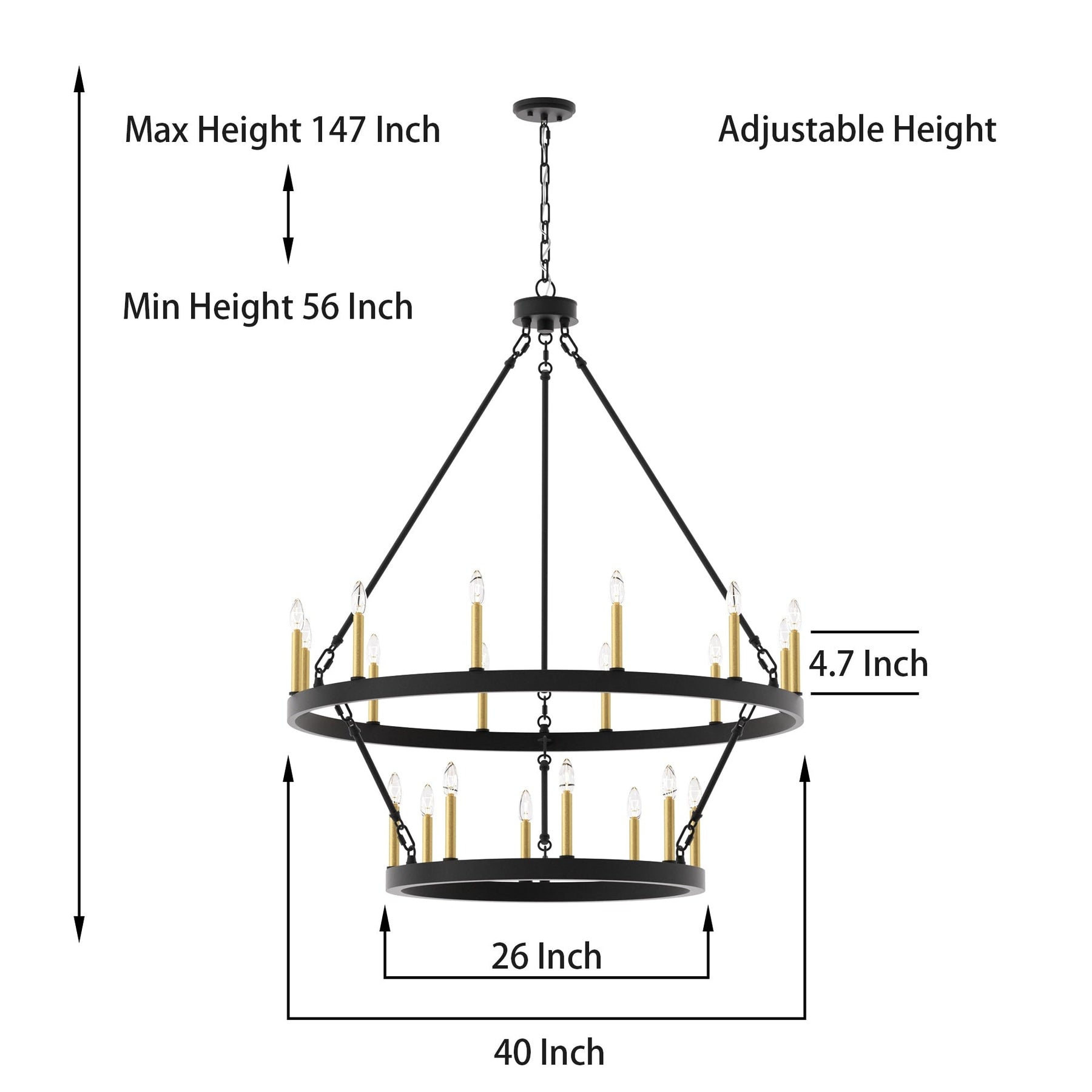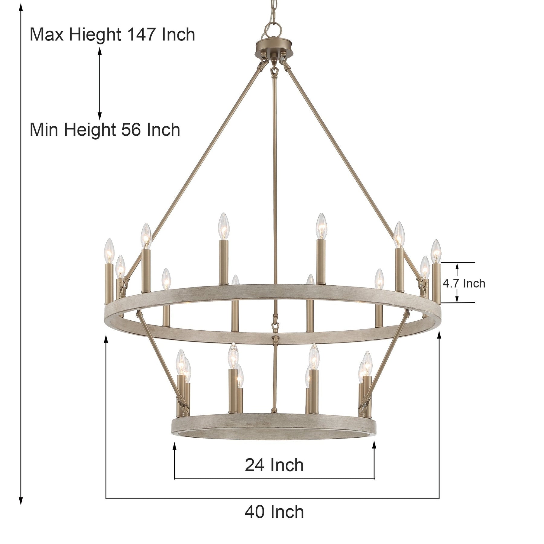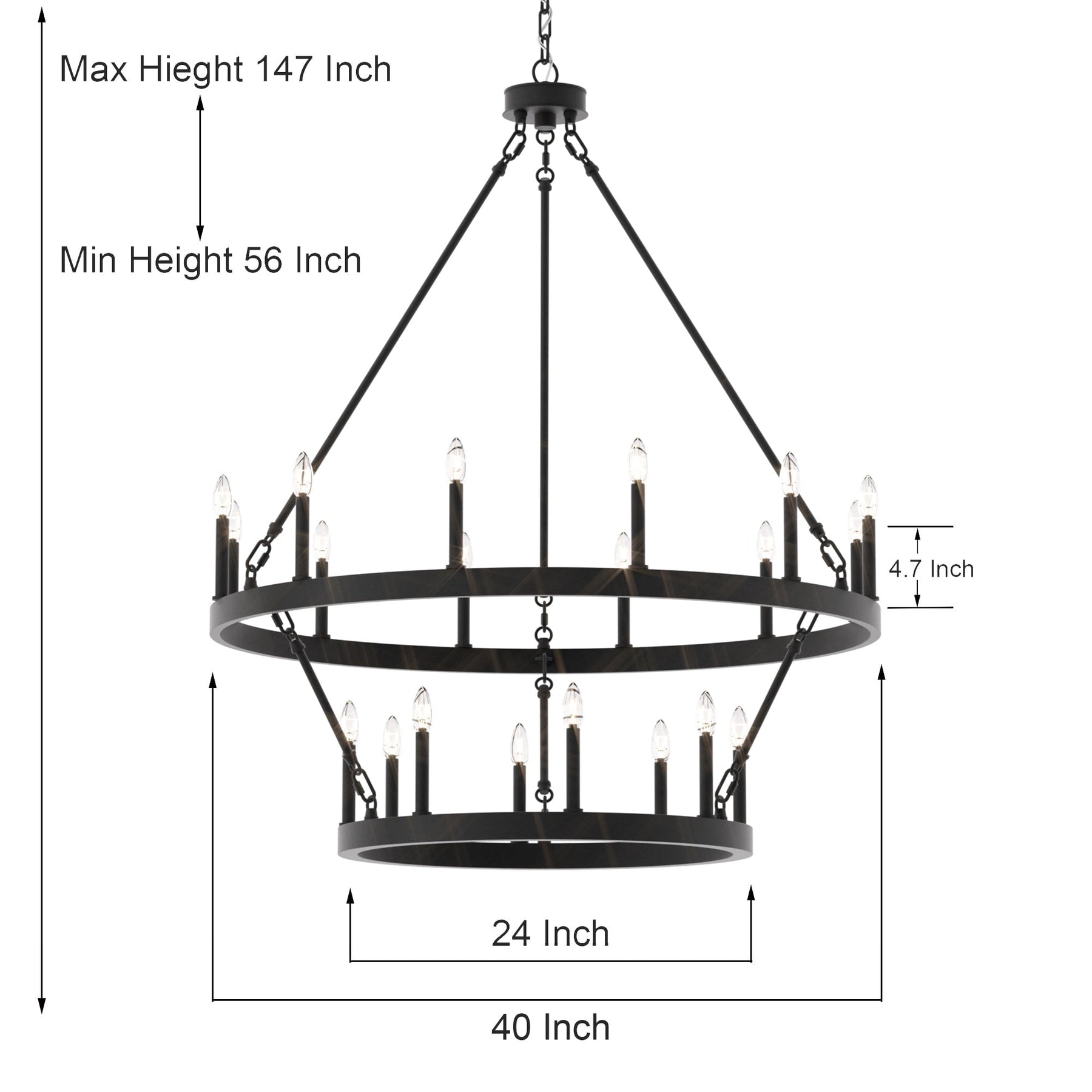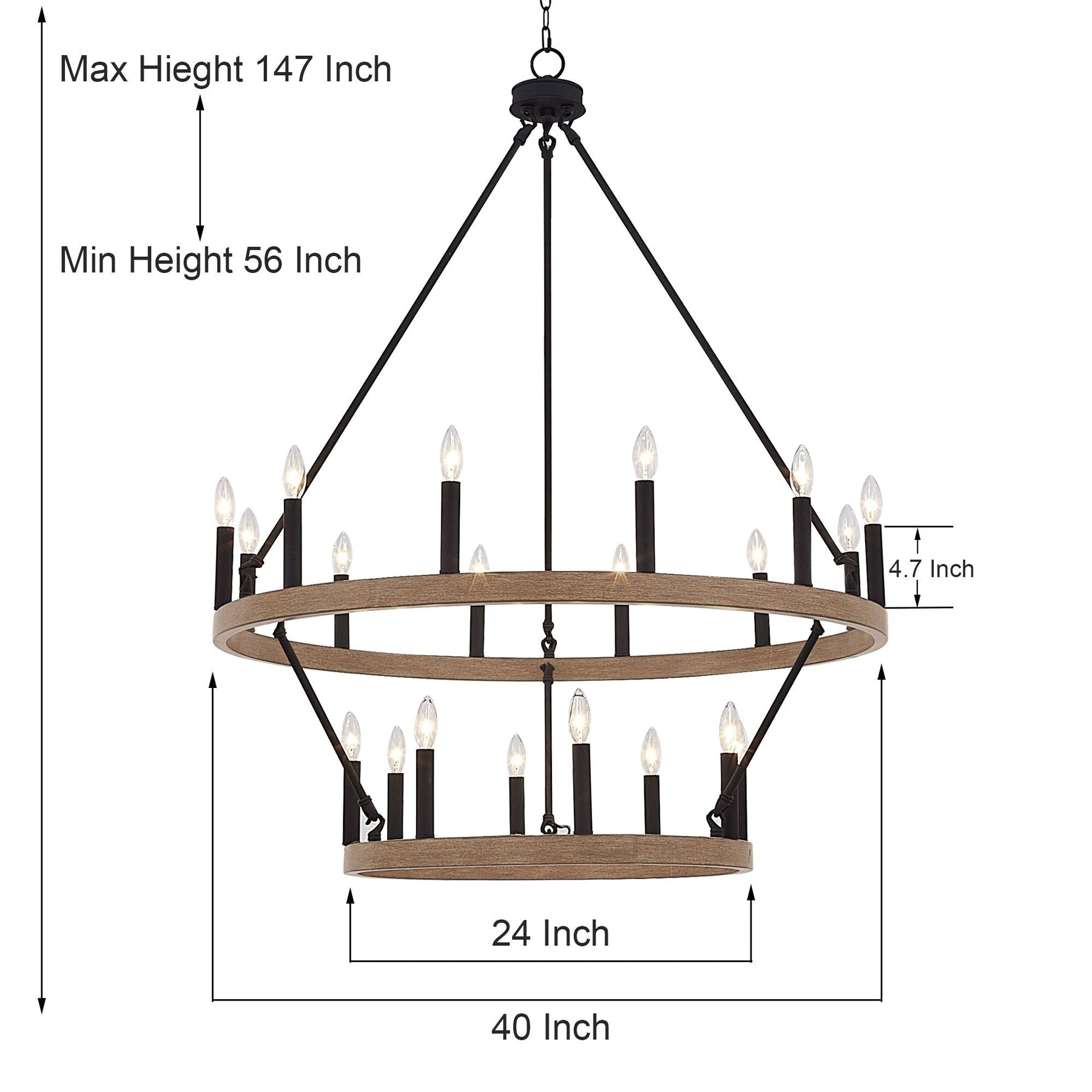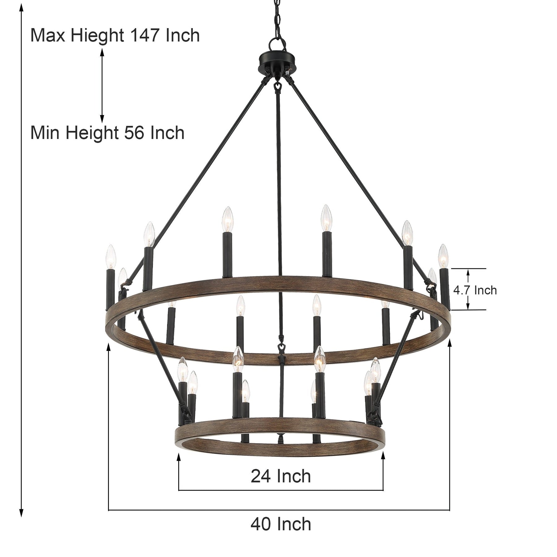 Brighten up your living space with the Farmhouse Rustic Large Wagon Wheel Chandelier, made of steel and available in a variety of colors, this chandelier is durable and adds charm to a variety of styles. With 2-tier wagon wheel and twenty candlestick, which is perfect for fully illuminating a large space like living room, dining room,  and large two story foyer/ entryway. Customize your space with candle-base bulbs for a vintage french country look or stick bulbs for a modern touch.