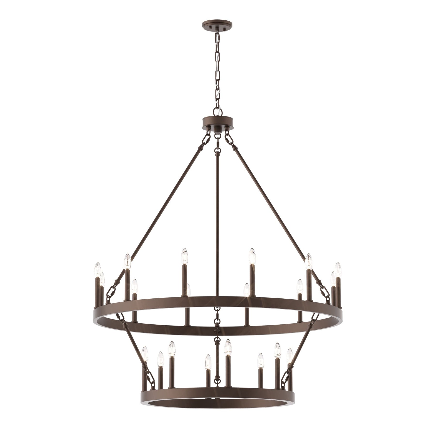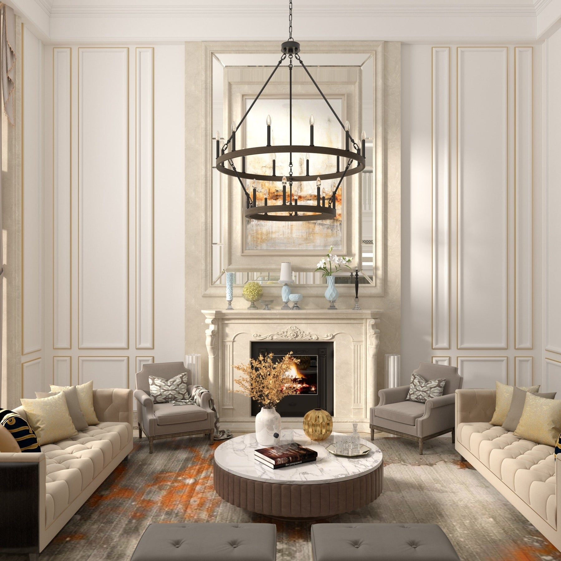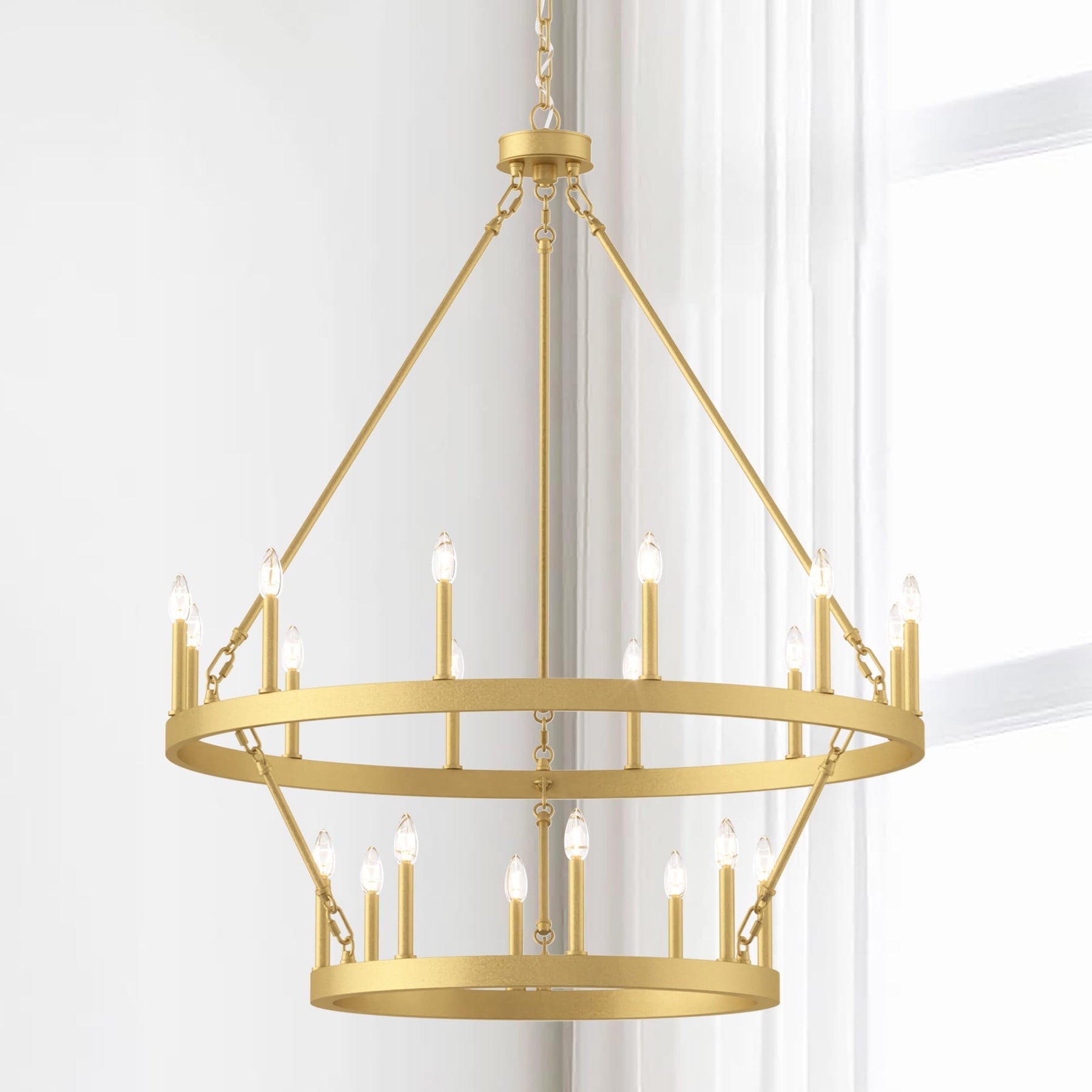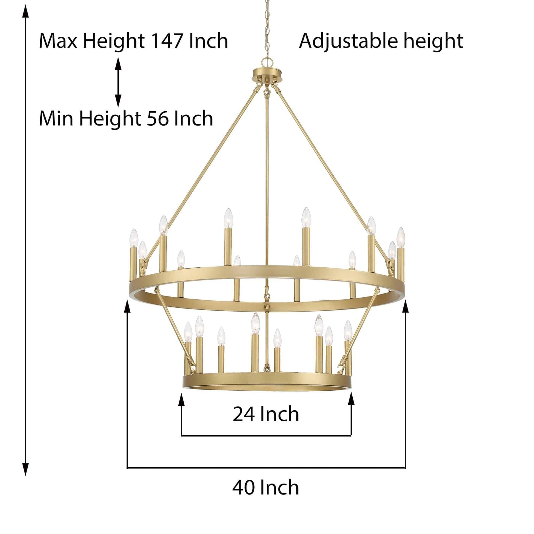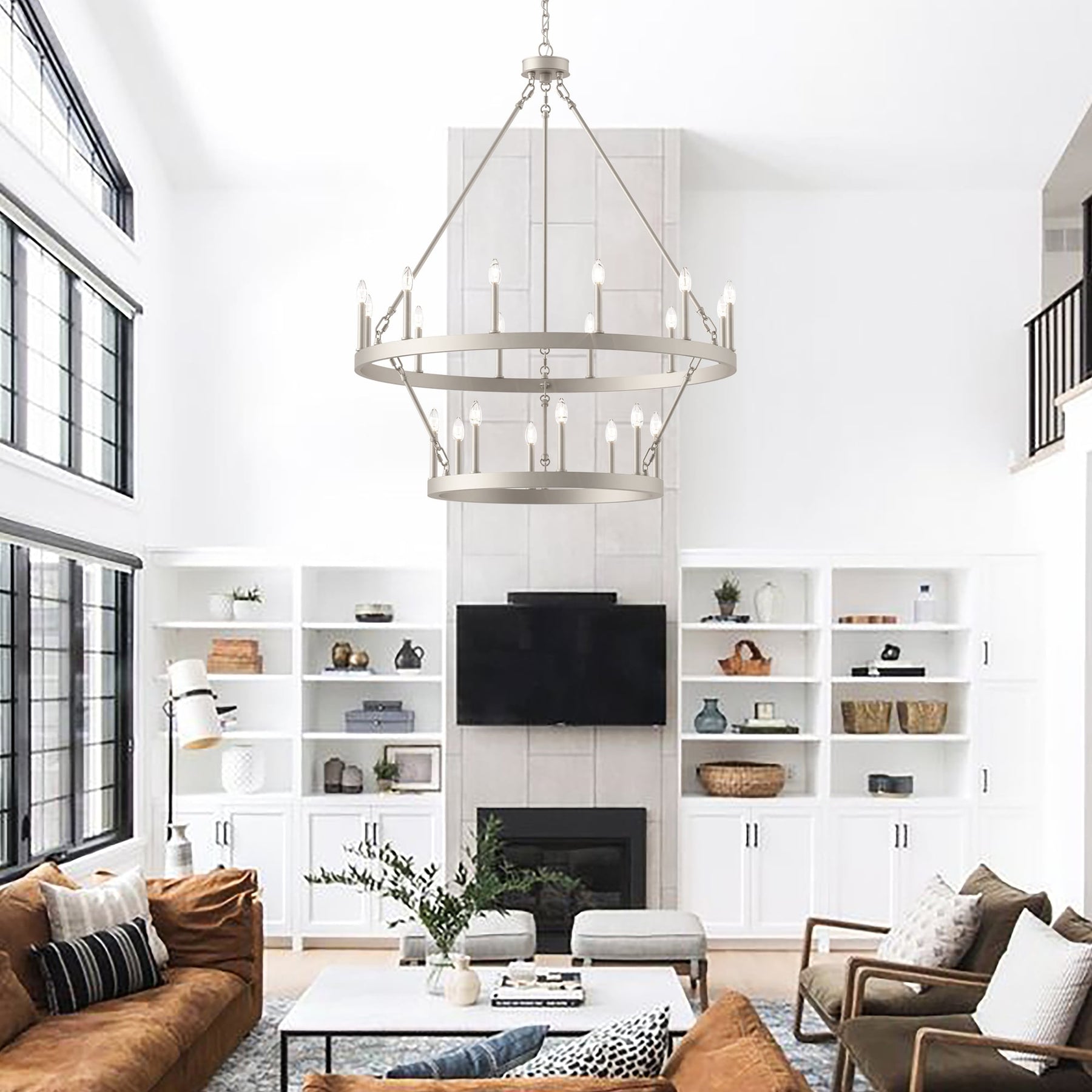 Brighten up your living space with the Farmhouse Rustic Large Wagon Wheel Chandelier, made of steel and available in a variety of colors, this chandelier is durable and adds charm to a variety of styles. With 2-tier wagon wheel and twenty candlestick, which is perfect for fully illuminating a large space like living room, dining room,  and large two story foyer/ entryway. Customize your space with candle-base bulbs for a vintage french country look or stick bulbs for a modern touch.