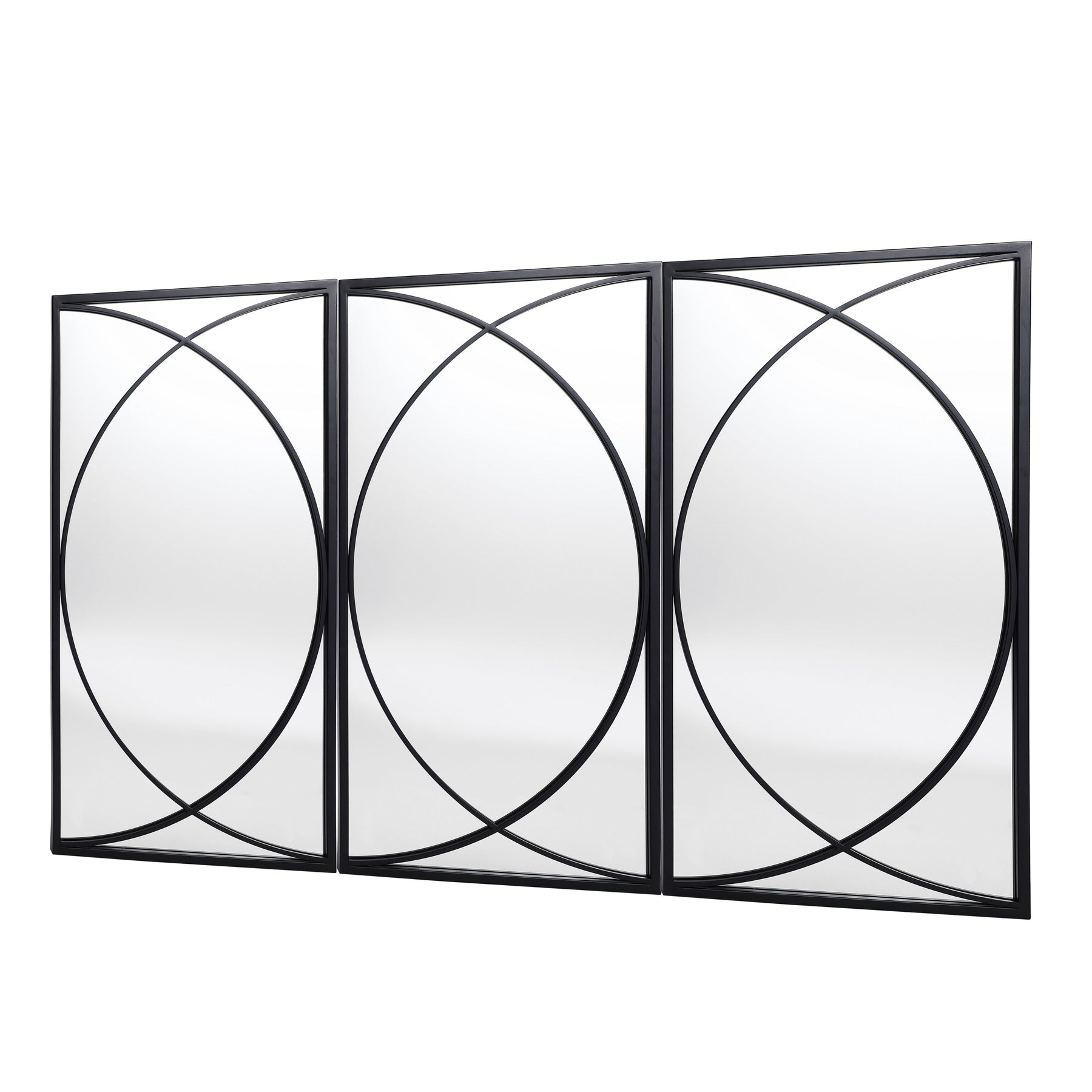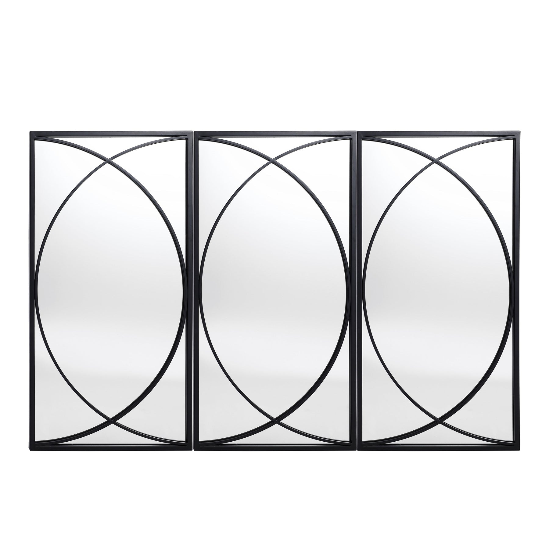 Upgrade your living space with these premium quality black metal rectangular wall mirrors. The set includes three mirrors with a contemporary design that can be arranged together or separately in various locations to add a personalized touch to your decor. The mirrors boast a high-quality glass surface that provides crystal-clear reflections, making them perfect for both functional and decorative purposes. The beautiful modern design features two semicircles intersecting in the middle, allowing you to mix and match them according to your needs and creativity..