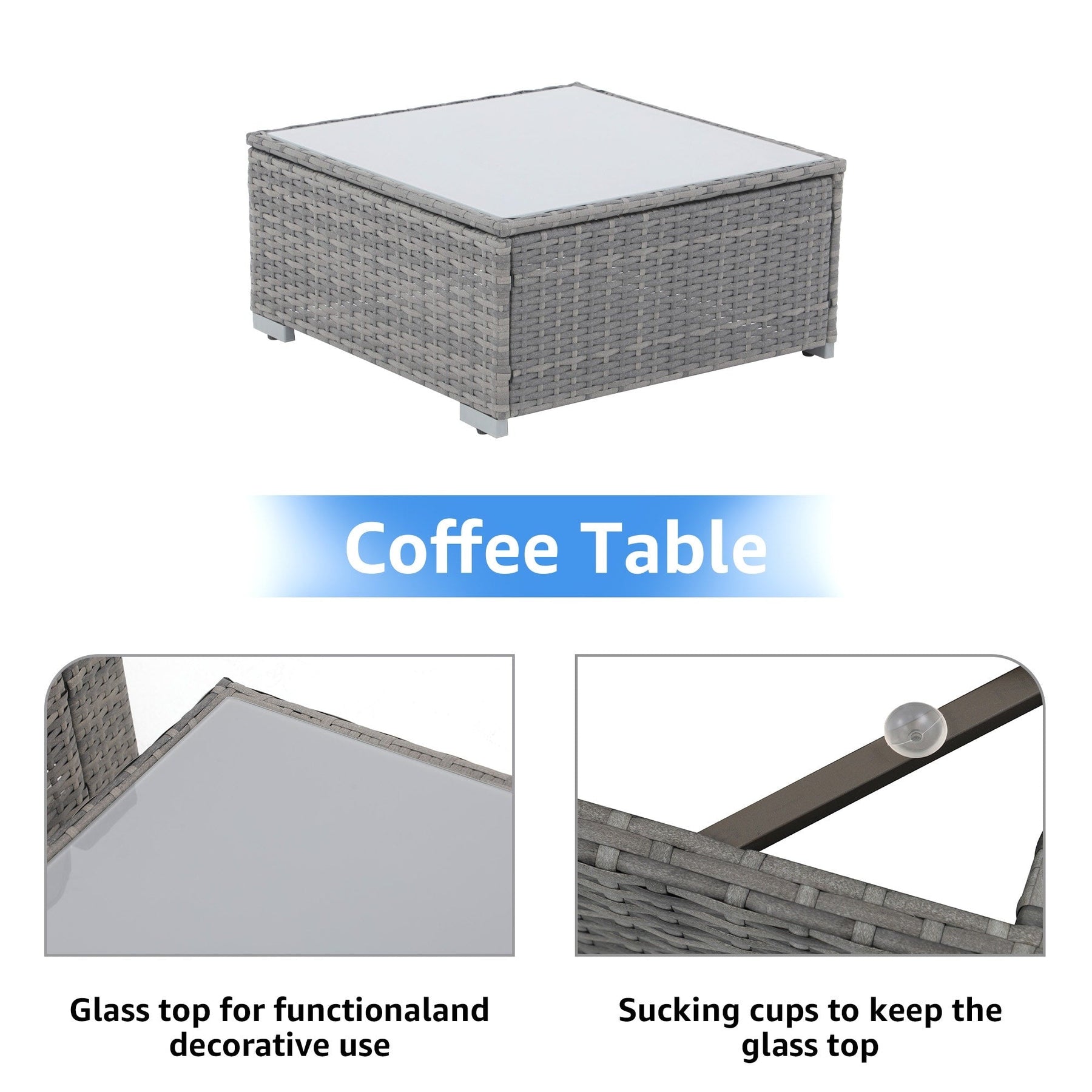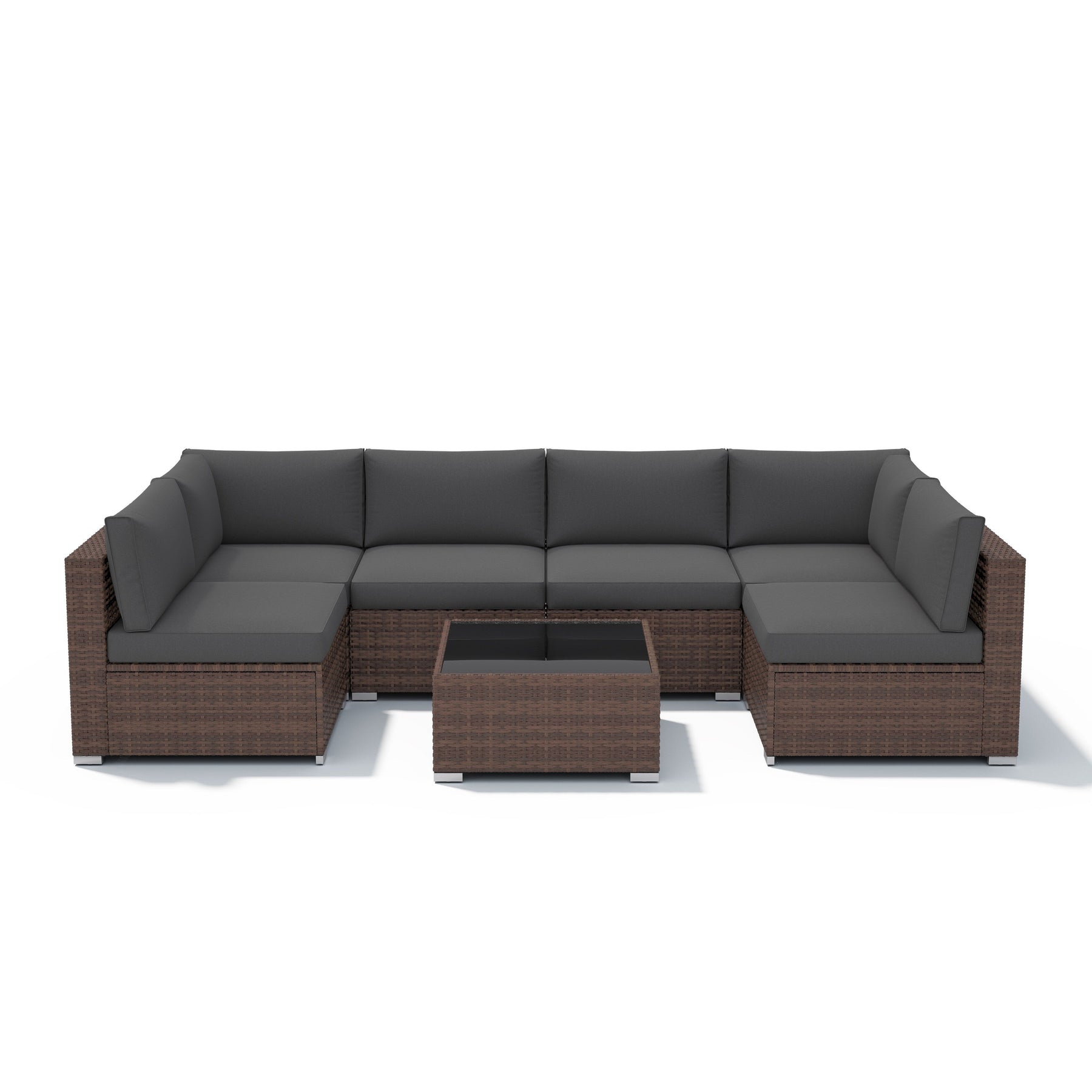 Add elegance and comfort to your outdoor space with the Wicker/ Steel 7-piece Outdoor Cushioned Sectional Sofa Set. The set features a sturdy steel frame wrapped in durable wicker that resists rust and outdoor elements. Cushions on each seat provide maximum comfort. With easy assembly and multiple configurations available, you can customize the set according to your needs.  In addition, a side table is included for added functionality and decoration.