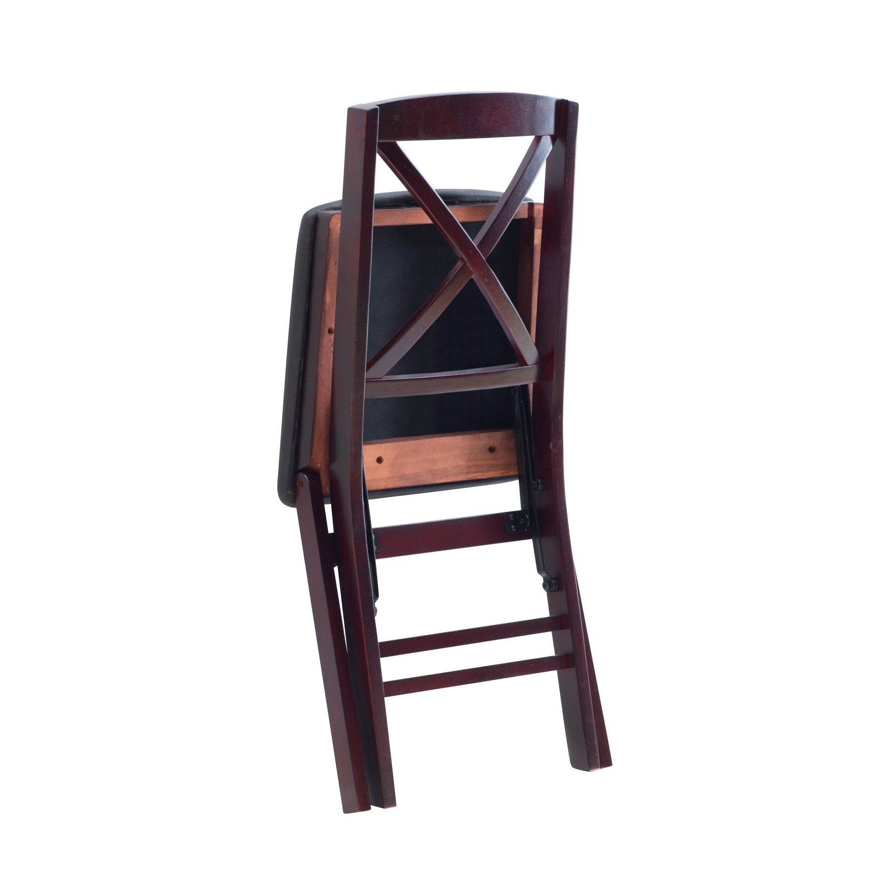 Stylish seating with the convenience of a folding chair. This pair of folding chairs adds an extra dash of elegance for dining or entertaining. The wood frames feature a classic x back and a wipe clean, faux leather padded seat with the appearance of leather, and a rich merlot finish. Front and rear supports provide extra stability. The space saving chairs fold for easy set up and storage. No assembly required.