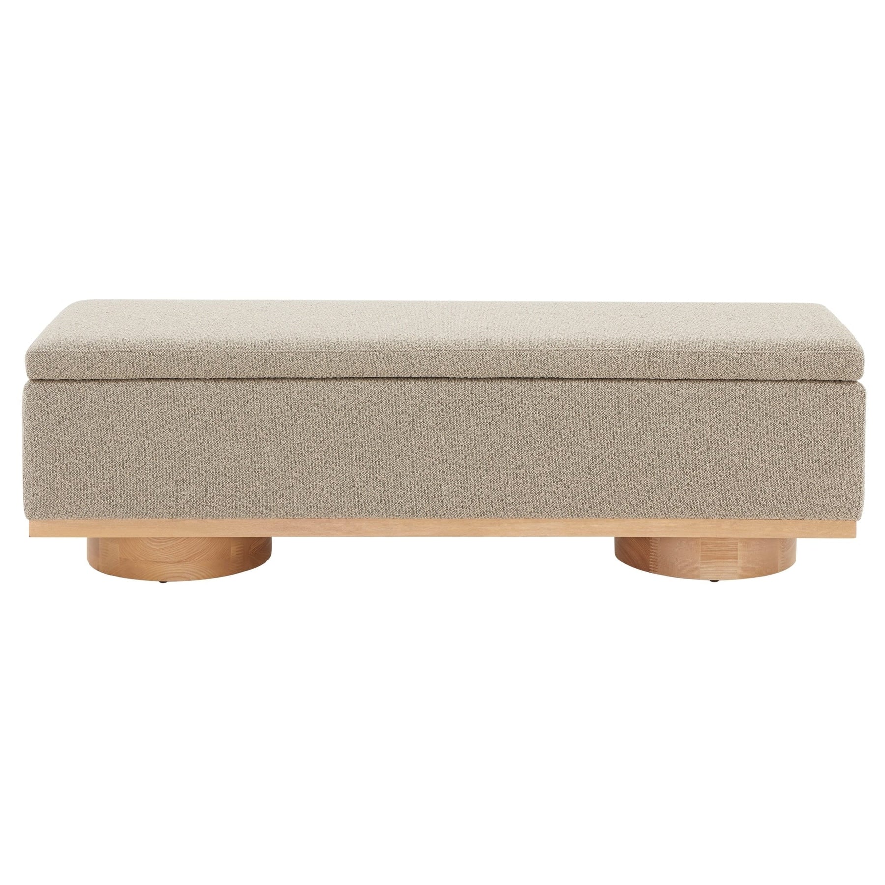 Bring any dull corner to life with our comfy and versatile bench. The bench features a comfortable and generously padded seat. Accented with the warm tones and texture of ash wood, our bench remains elevated upon chunky cylindrical legs. It is upscaled with plush textures of boucle in a charming color. A perfect marriage of form and function, our bench can become the perfect complement to your entryway, bedroom, or any place that needs extra seating.